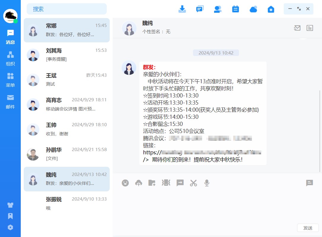 个性化功能设置:在界面显示和功能使用上,能有个性化的设置功能,可自由调整即时通讯的显示界面、字体,以及能实现智能的消息推送、日程提醒等,满足不同员工对于沟通平台的视觉和使用需求。