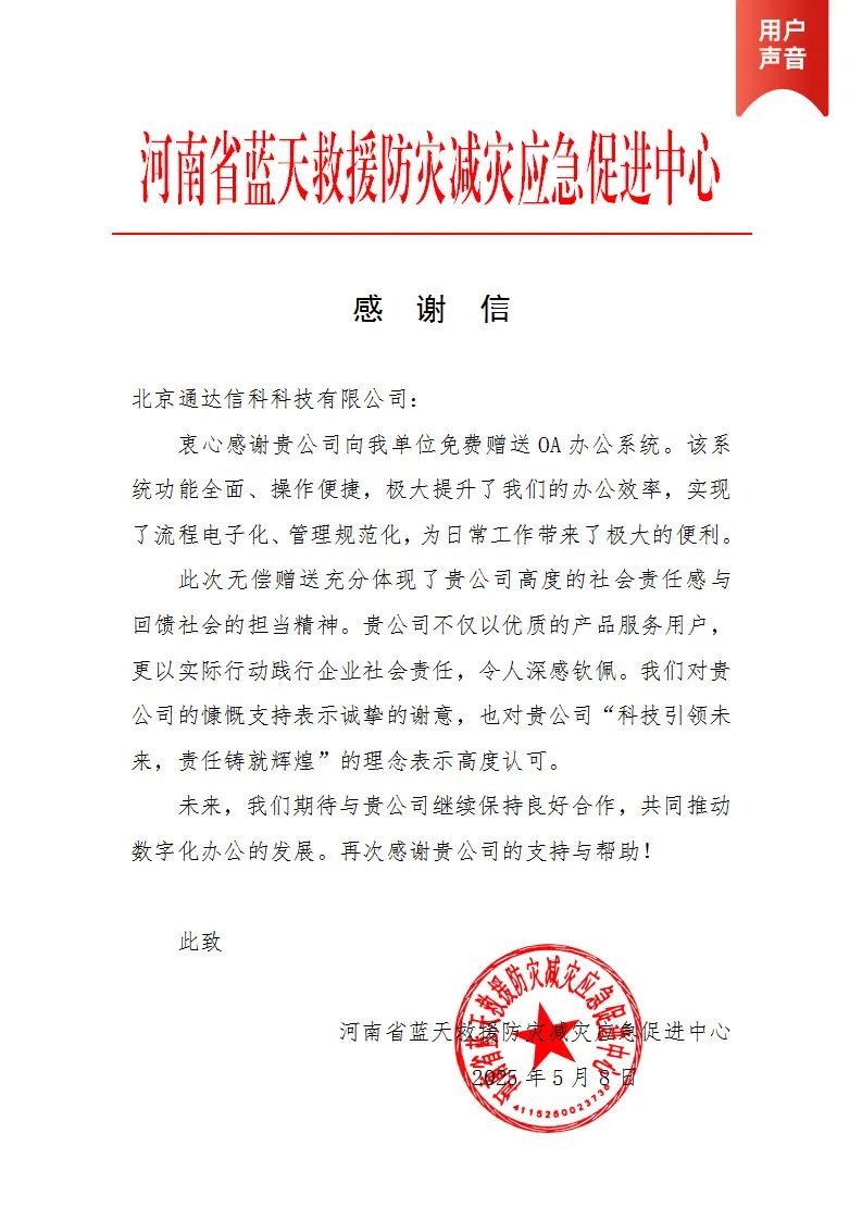 作为河南省内重要的民间救援力量,该中心一直致力于防灾减灾、应急救援等公益事业。获赠通达OA智能办公系统后,中心将能够更高效地协调救援行动,优化资源调配,并通过智能化的流程管理,提升应急响应的速度和效率,为当地居民提供更及时、更专业的救援服务。