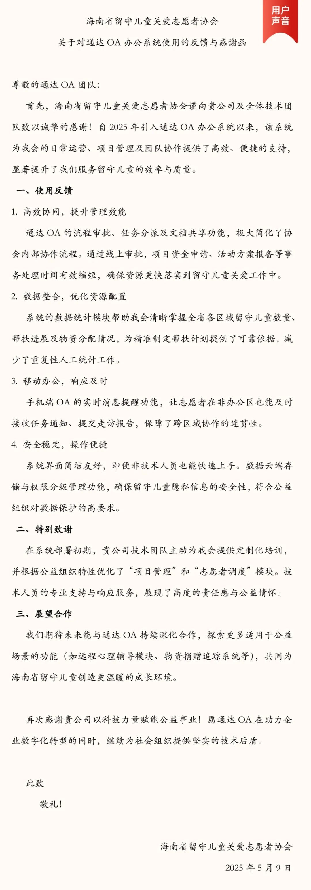 该协会专注于留守儿童的教育与关爱服务,致力于为孩子们创造更好的成长环境。通达OA智能办公系统将助力协会优化志愿者管理流程,提升服务响应速度,并通过高效的信息共享平台,促进团队成员之间的沟通与合作,进一步扩大关爱服务的覆盖面和影响力。