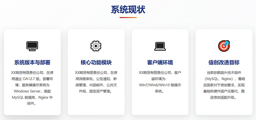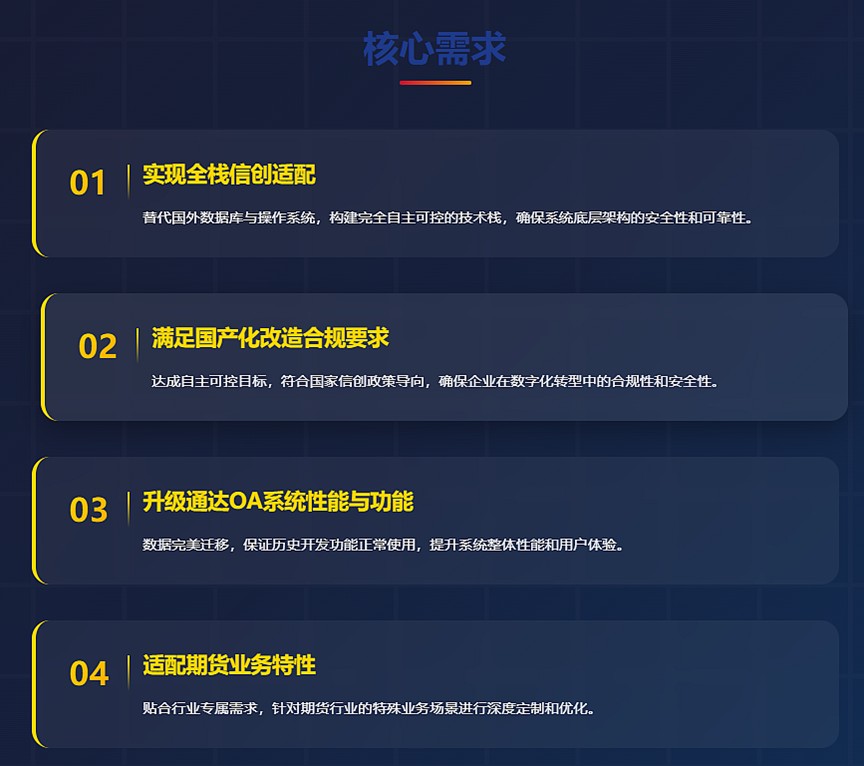 核心需求聚焦于实现自主可控,具体包括完成全栈信创适配以替代国外数据库、操作系统,满足国产化改造合规要求;升级通达OA系统性能与功能,在自主可控的基础上提升办公协同效率,并更好地适配期货业务特性。