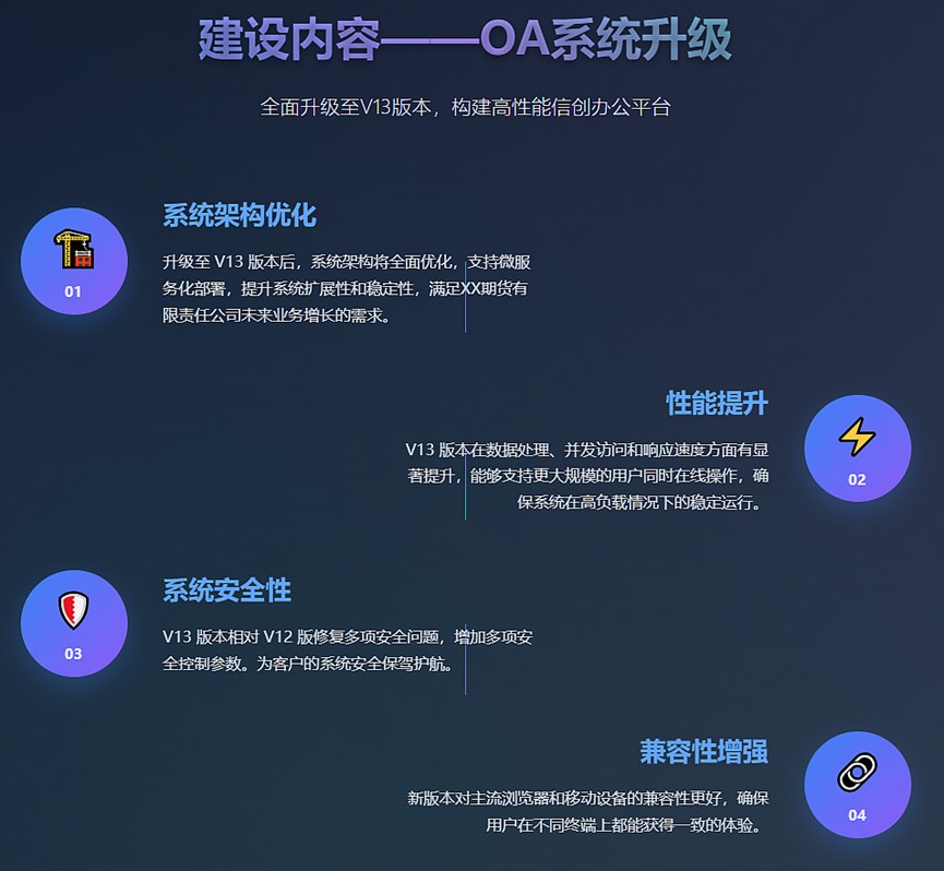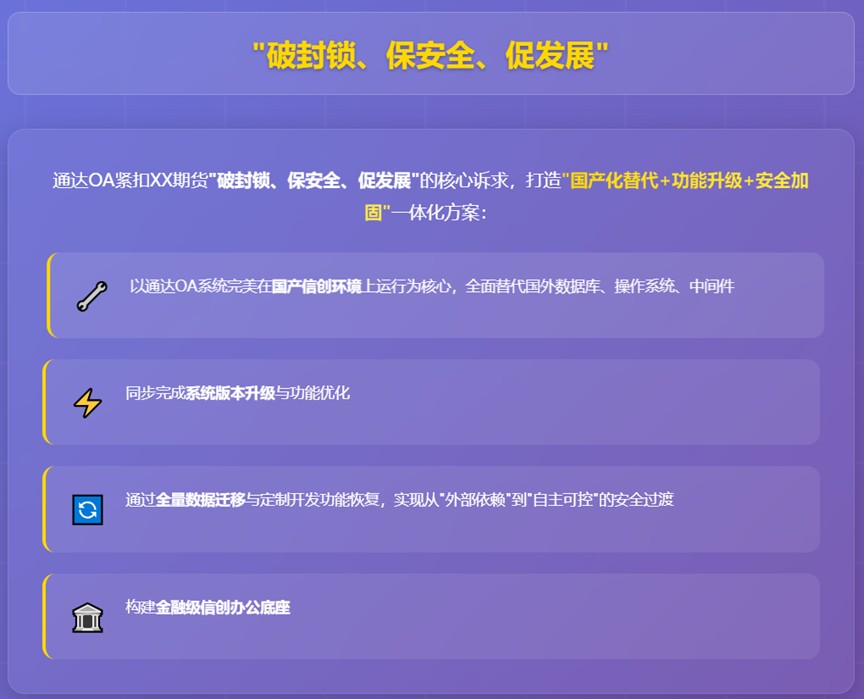 通达OA紧扣XX期货“破封锁、保安全、促发展”的核心诉求,打造“国产化替代+功能升级+安全加固”一体化方案:以通达OA系统完美在国产信创环境上运行为核心,全面替代国外数据库、操作系统、中间件;同步完成系统版本升级与功能优化;通过全量数据迁移与定制开发功能恢复,实现从“外部依赖”到“自主可控”的安全过渡,构建金融级信创办公底座。