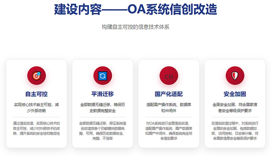 通达OA系统信创改造全面适配国产操作系统、数据库及中间件,实现核心技术自主可控,对系统进行全面的安全加固,包括数据加密、访问控制、日志审计等,梳理历史数据和定制开发功能、流程,实现历史数据完美迁移与定制功能、流程的恢复,确保数据完整、安全、可用,延续用户操作习惯。