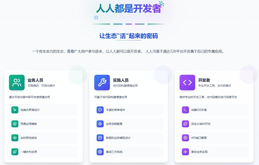 一个有生命力的生态,需要广大用户的积极参与。人人都可以成为开发者,基于通达T20平台开发属于自己的专属应用。“分层开发、协同共创”的模式,让每个角色都能贡献价值。当全组织的创造力被激活,办公系统便不再是“固定不变的工具”,而是“随需生长的有机体”,更富创新性,更契合组织业务发展的节奏。