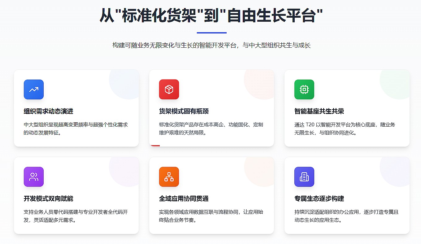 传统“标准化货架式产品”难以适应中大型组织持续变化和发展的需要,存在采购成本高、功能固化、系统臃肿、定制开发与维护困难等问题。通达T20智协同平台提供可随业务无限演进与生长的智能开发平台,能够灵活应对快速迭代与个性化需求,与中大型组织共同成长。