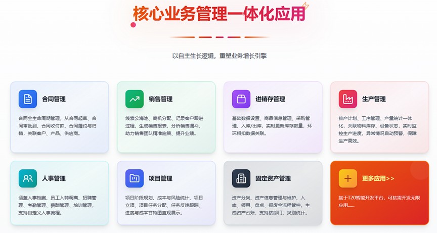 智能开发平台是通达T20的核心“技术底座”。从行政办公到人力资源,从项目管理到财务管理,从销售管理到生产制造……组织内所有业务领域的应用,均可基于这一平台进行开发与构建。