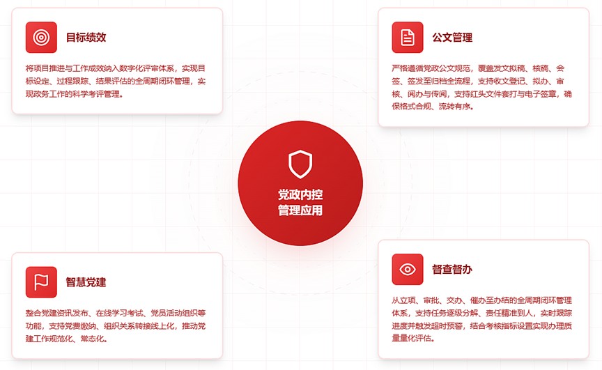 党政内控一体化应用秉持“合规刚性与效能弹性共生”理念,以全周期闭环管理为核心模式,将公文流转的规范严谨、督查督办的全过程可控、目标绩效的科学考评与智慧党建的规范常态纳入统一数字化框架。依托自主开发能力,组织可按需构建适配党政场景的专属工具,通过“规范流程数字化、责任链路透明化、考核评估数据化”等核心特性,为党政机关治理现代化提供“可生长、强协同、高可靠”的数字化支撑。