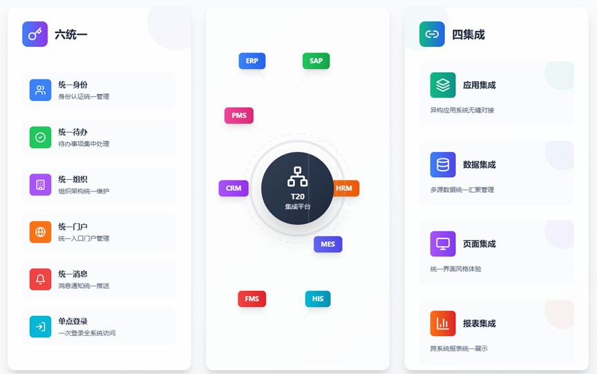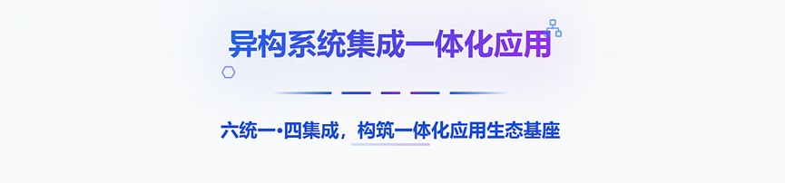 业务集成一体化应用秉持“全域贯通,无缝协同”理念,以“六统一”和“四集成”为核心模式。“六统一”包括:统一待办、统一身份、统一门户、统一消息、统一组织、单点登录;“四集成”包括:应用集成、数据集成、页面集成、报表集成。