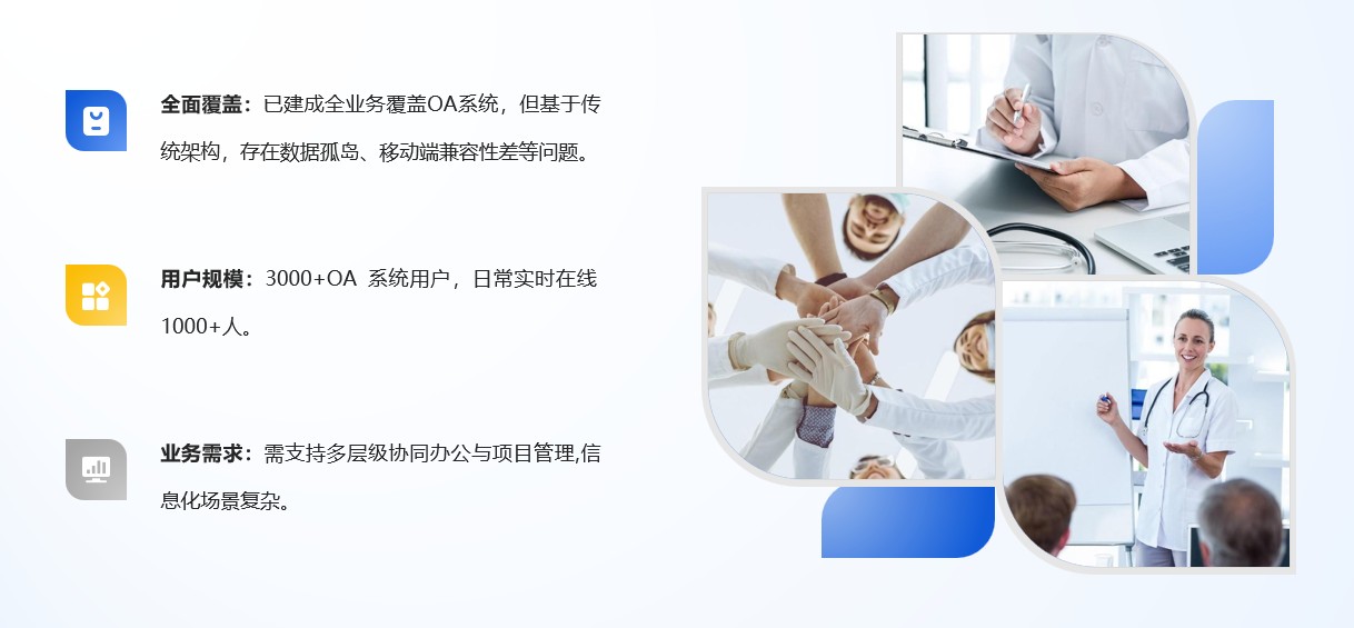 在业务高速扩张的背景下,企业面临着系统并发性能不足、信息孤岛凸显以及运营安全可靠性要求的双重挑战。为构建高效协同、安全稳定的数字化运营体系,企业正式启动通达OA系统全面升级与智能化改造项目。