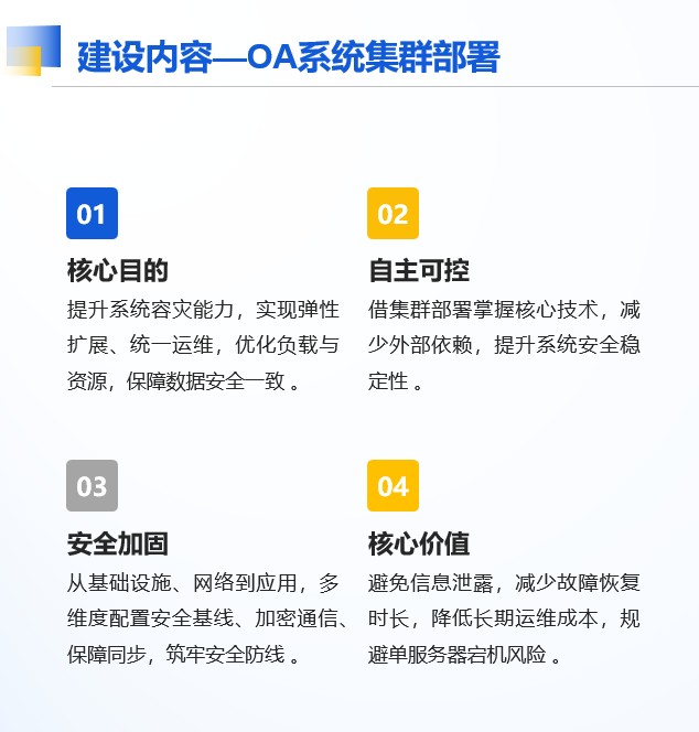 为彻底解决由单台服务器引发的OA系统性能瓶颈、频繁宕机、响应卡顿及系统崩溃等一系列问题,项目采用高性能、高可靠、高安全的新型系统架构,对OA系统进行全面高可用部署。架构基于Linux平台Debian操作系统构建,具备优异的性能表现、良好的扩展性以及更低的总体拥有成本,从而为系统长期稳定、高效运行提供坚实基础。
