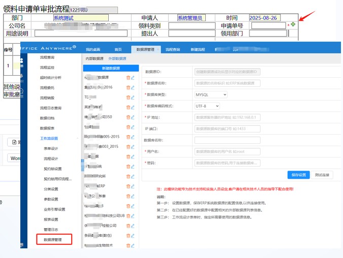 通过跨系统数据直连能力,OA中的业务单据可直接利用数据选择控件实时读取U8等第三方系统数据库信息,无需定制开发即可实现数据即选即用,快速填充至单据中,显著简化查询与录入流程。流程审批结束后,系统自动将审批结果及状态等关键信息回传至U8系统,形成数据闭环。依托标准化对接方式,有效打破系统数据孤岛,构建了“调取-填单-回传”一体化的完整数据协同生态,实现跨系统业务的高效贯通。