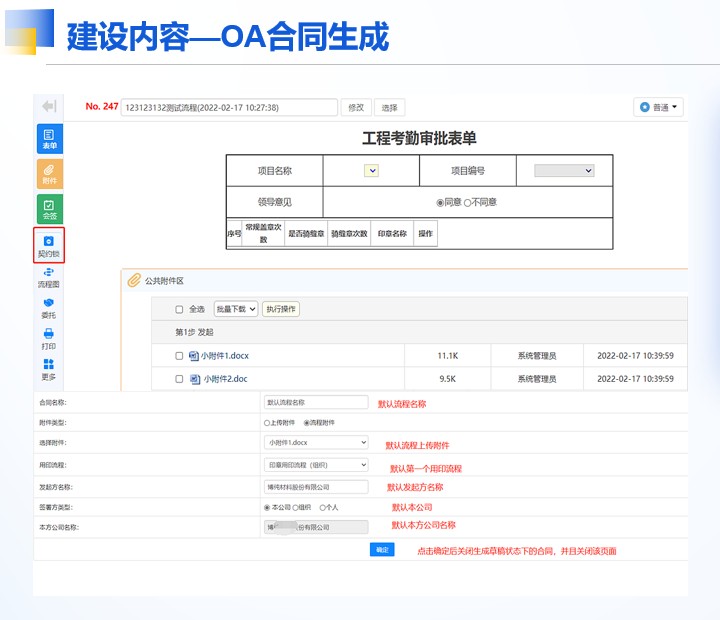 在自主上传合同流程中,发起人通过上传已填写完毕的合同附件并点击“契约锁”按钮,填写相关参数后即可生成草稿合同。每个流程支持上传一个附件,并可在契约锁中生成多个合同文档。系统自动填充流程名称、附件类型、所选附件、用印流程、发起方名称、签署方类型及本公司名称等关键信息,显著提升合同起草效率与准确性。