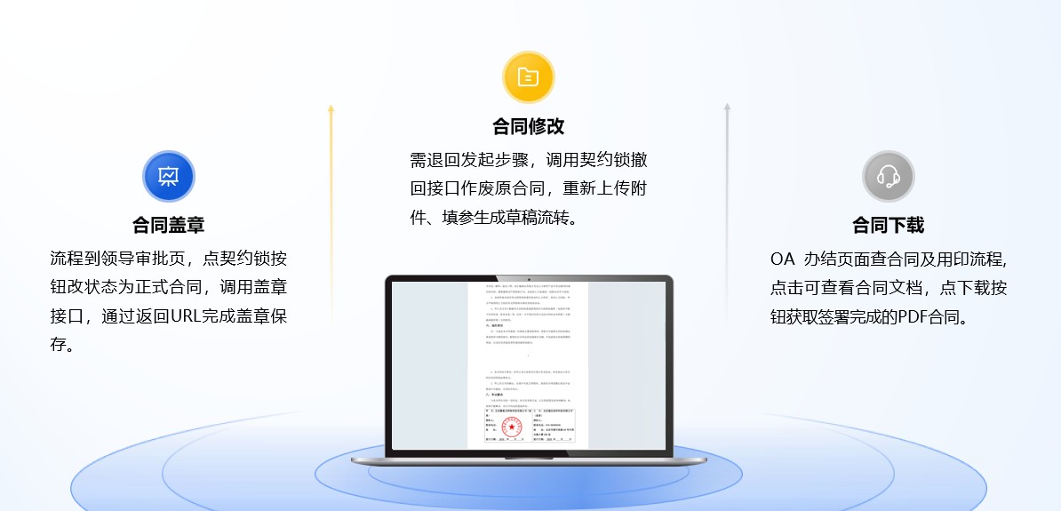 本系统深度集成契约锁电子签章,支持手写、扫码及刷脸等多种线上签署方式,突破地域限制实现全流程不见面签署。提供多人会签、顺序签及批量签署能力,显著提升签署效率,完成后文件自动归档至OA或契约锁库,形成统一电子档案。依托OA权限体系严控文件访问与下载,结合加密存储与完备审计功能,全面保障电子签署安全与合规管控。
