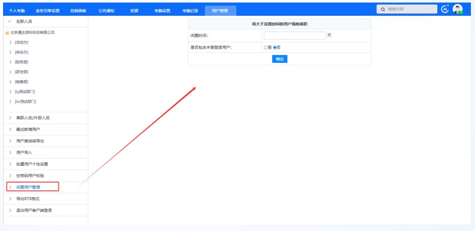「组织架构设置清理离职人员」。为加强信息系统安全管理,规范用户账户生命周期管理,现新增“闲置用户强制离职”功能。系统管理员可自定义账户休眠期限(如30天未登录),自动检测并筛选出符合条件的闲置账户,经确认后可批量执行强制离职操作,将其从组织架构中移除并禁用所有系统权限。