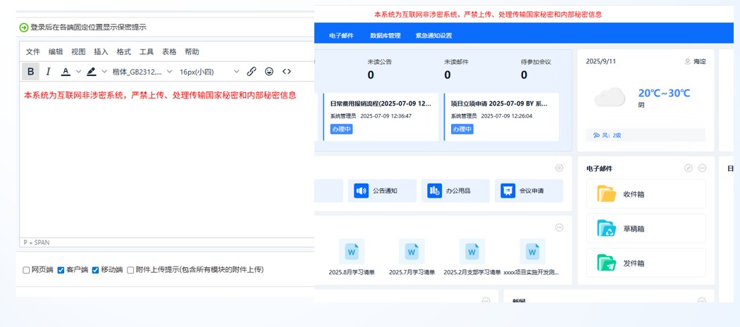 在系统管理的紧急通知设置中,新增了可自定义的保密提醒功能,支持随时配置保密声明与提醒内容。