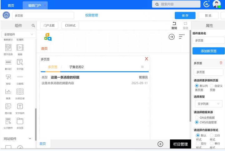 门户页面新增多页签组件,让您可以在一个页面内通过页签形式组织多个功能模块。用户点击切换即可浏览不同内容,既节省空间又提升操作体验,让门户设计更加灵活高效。