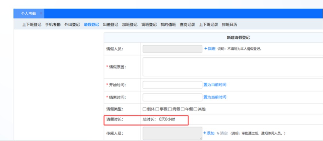 ①「请假登记」环节,新增请假时长自动计算与展示功能。您提交的每一笔申请都会清晰显示具体天数/小时,让假期使用明明白白。