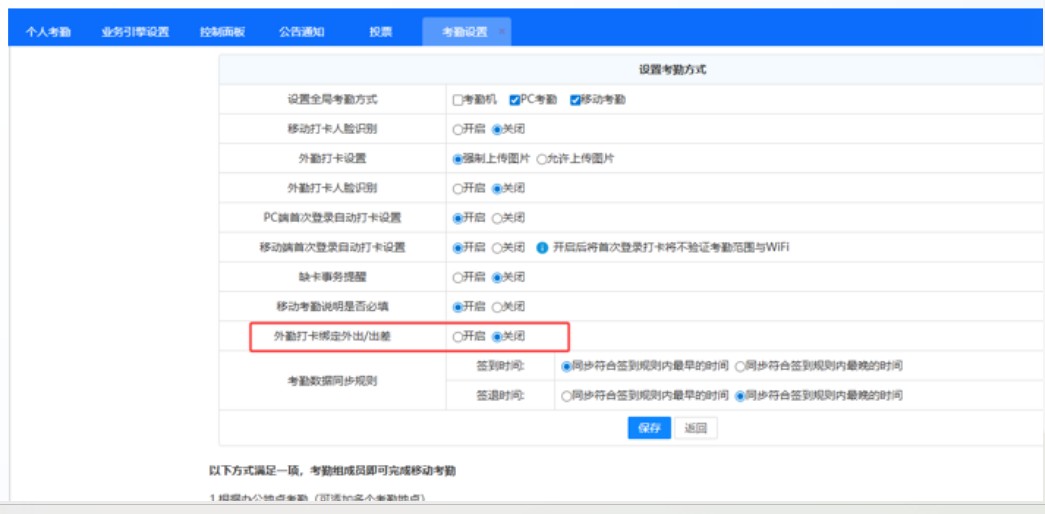 ③「外勤打卡绑定外出/出差」。为规范外勤考勤管理,确保每次外勤打卡都有合规、可信的业务事由,V13.4版本针对“外勤打卡”功能进行升级。外勤打卡绑定规则支持全局开关,管理员可根据企业考勤制度,在考勤设置中统一启用或停用此功能,实现灵活的规范化管理。