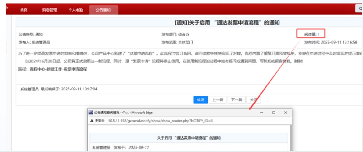 为帮助发布者精准评估通知的传达效率和覆盖范围,现为公告通知模块新增“阅读量”统计与查看功能。系统会自动统计每篇公告被点击查阅的总次数,并以可视化数据的形式清晰展示。