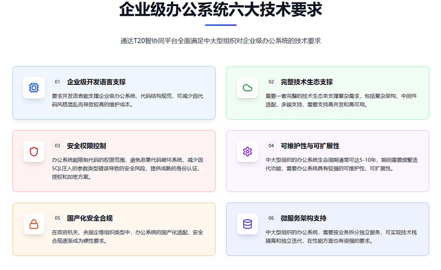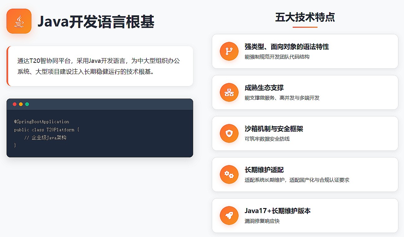 通达T20智协同平台以Java企业级开发语言为核心,为中大型组织办公系统及复杂项目奠定了坚实可靠、面向长期演进的技术根基。