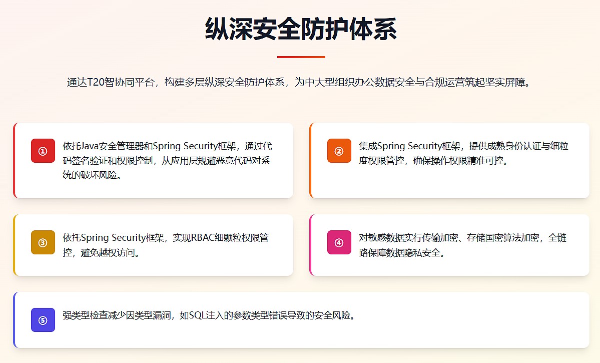 通达T20智协同平台构建了多层纵深安全防护体系,为中大型组织的办公数据安全与合规要求提供全方位保障。