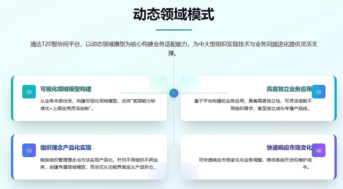 通达T20智协同平台以动态领域模型为核心,秉持高度灵活的业务适配能力,支持中大型组织随业务变化持续优化,实现技术与业务的同步演进。