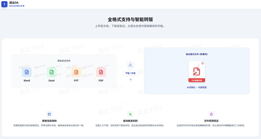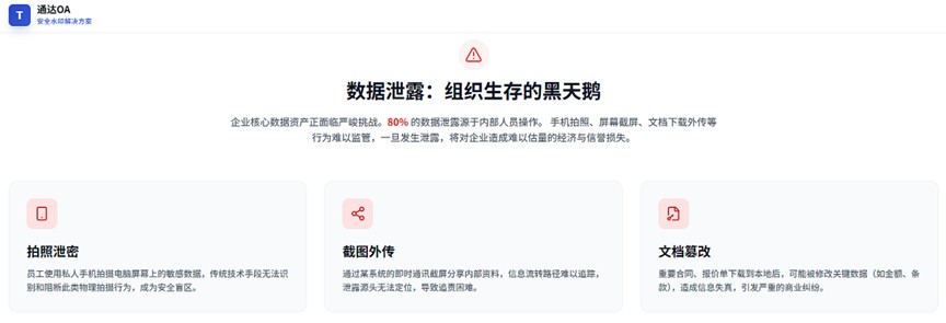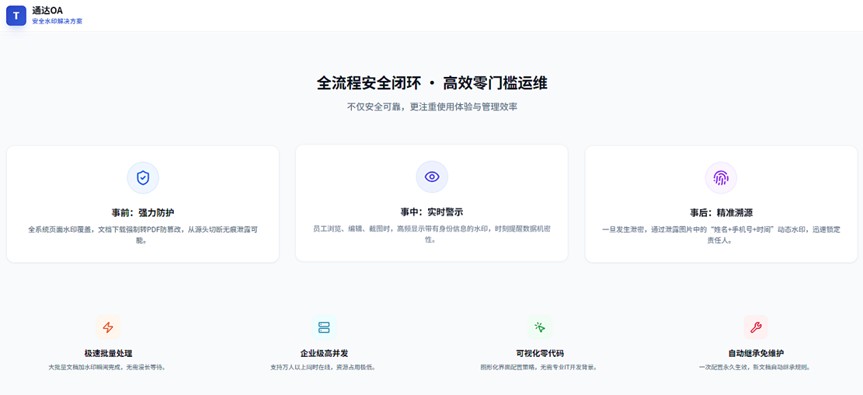 随着大量文档在OA系统中被频繁查阅、下载与流转,数据安全防护的重要性日益凸显。为此,通达OA正式推出“文档+页面”双水印解决方案,致力于构建全流程、可追溯的数据防泄露体系。