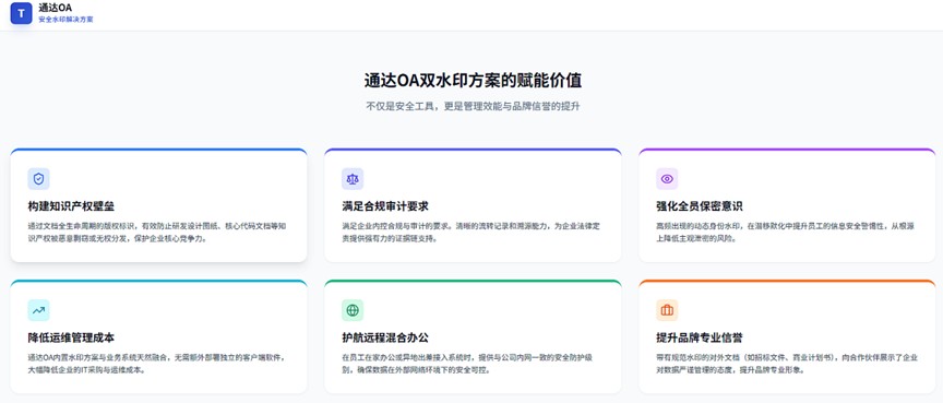 通达OA“文档+页面”双水印解决方案,在筑牢数据防线的同时,更从知识产权保护、合规审计、成本控制及远程办公支持等多维度为企业全面赋能,显著提升管理效能与品牌信誉。