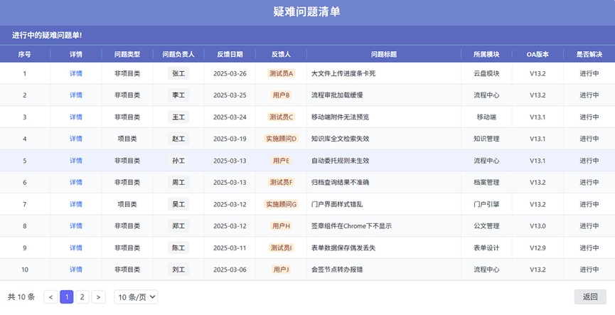 通达OA质量管控决策看板,可自动归集与整合分散在不同业务单据中的质量数据,通过全景式、多维度、可视化的方式集中呈现。它不仅清晰展示质量问题汇总、多渠道反馈数量与问题归零趋势、用户反馈变化曲线等信息,还支持数据穿透分析与跟踪闭环,帮助企业实现对产品质量的全面、精准管控。