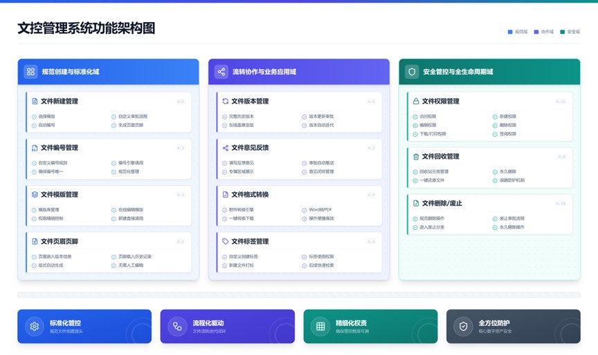 其中,“一个核心”是指建立以企业核心文件全生命周期管控为中心的体系,确保顶层标准落地,让文件切实发挥指导与规范作用。“四大支撑”则从标准化管控(规范源头)、流程化驱动(闭环流转)、精细化权责(精准可溯)、全方位防护(保障安全)四个维度,共同构筑起严密、高效、安全的文件管理防线。