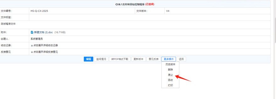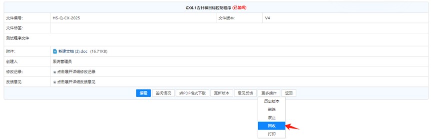 支持文件删除操作,删除后文件将进入回收站,可在回收站进行永久删除或还原操作,实现删除可逆;文件废止需进行审批流程,审批通过后,文件将自动进入回收站的“废止”分类下,可在该分类下进行永久删除操作,规范文件废止管理。