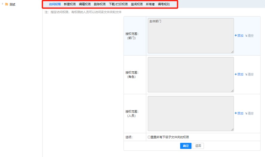 本功能构建以文件夹为单位的精细化权限管理系统。在创建文件夹时,即可为其配置包括访问、新建、编辑、删除、下载/打印、签约、编号规则调用在内的详细操作权限。
