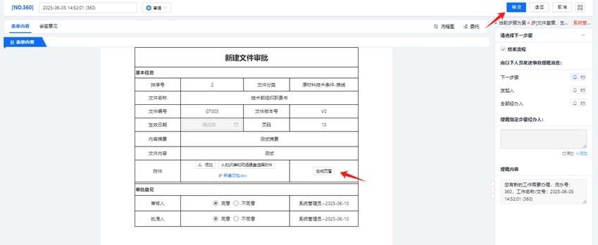 在OA知识库中可直接创建新文件。系统将自动生成文件排序号与唯一编号。发起流程审批后,文件将按预设规则自动生成标准化的页眉、页脚,并完成在线电子盖章,确保所有产出文件格式统一、身份合法。