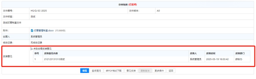 支持针对任一文件提交结构化反馈意见。反馈需经审批流程确认,通过后,意见将自动推送并归档至该文件专属的“反馈记录区”,形成永久、可追溯的意见档案。该机制实现了从意见提出、审批、记录到查阅的全流程闭环管理,确保每一次反馈都得以落实与追踪。