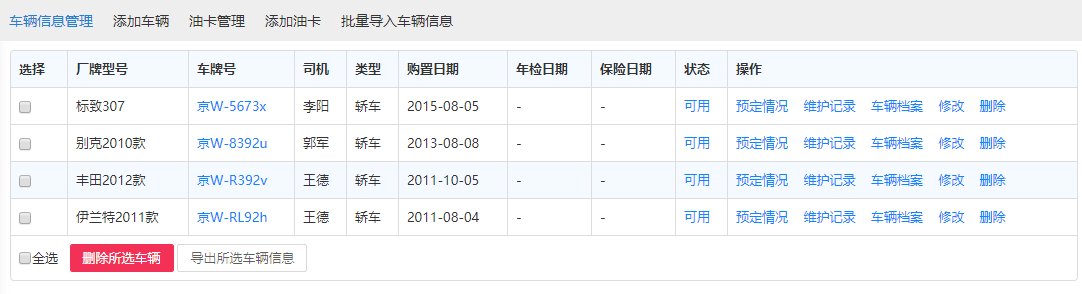 车辆信息管理模块用来管理车辆的基本信息,可添加新车辆,也可对已有的车辆信息进行修改和删除,还可查看每辆车的预定情况。将所有车辆按照状态分类列出,方便用户查询和管理。