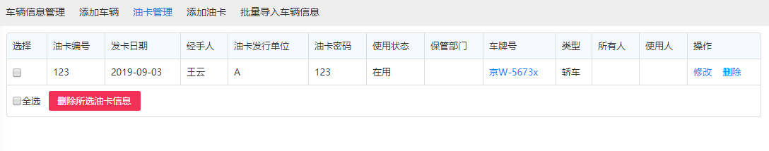 油卡管理,可以对已有的油卡进行编辑、删除操作。