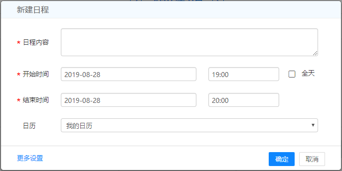 在日历视图下,系统提供两种创建方式——快捷新建和详细新建。点击顶部【新建日程】按钮,进入详细新建日程页面,或者单击日历面板上的日期,进入快速新建日程页面,在该页面中,可点击“更多设置”进入详细创建日程页面。在列表视图下,点击【新建日程】,进入详细新建日程页面完成创建日程。