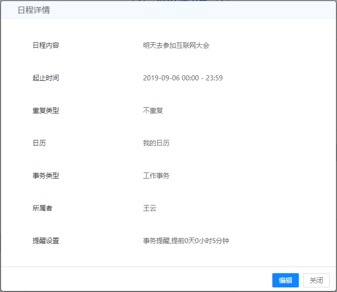 周期日程编辑分为编辑当前日程、编辑后续日程(含此日程)、编辑所有日程;普通日程编辑仅支持编辑当前日程。鼠标移入日程内容区,进入详情页面,选择【编辑】按钮,即可进行编辑。
