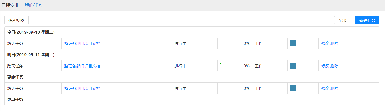 用户可建立个人工作任务,并以不同颜色标识其重要性。任务管理界面可一目了然的查看任务状态、完成进度等任务明细,还可以根据今日、明日、更晚任务和更早任务查看任务详情。