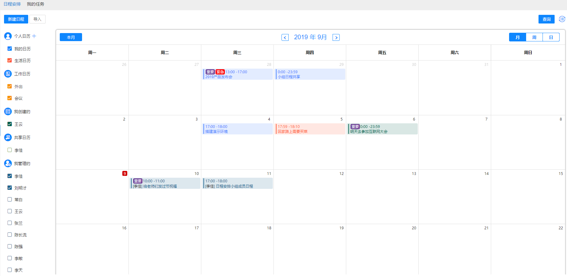 用户可通过日历选择控制相应日程的显隐,便于自己查看日程。在日历视图下,鼠标直接点击左侧日历列表,即可完成日历的筛选。