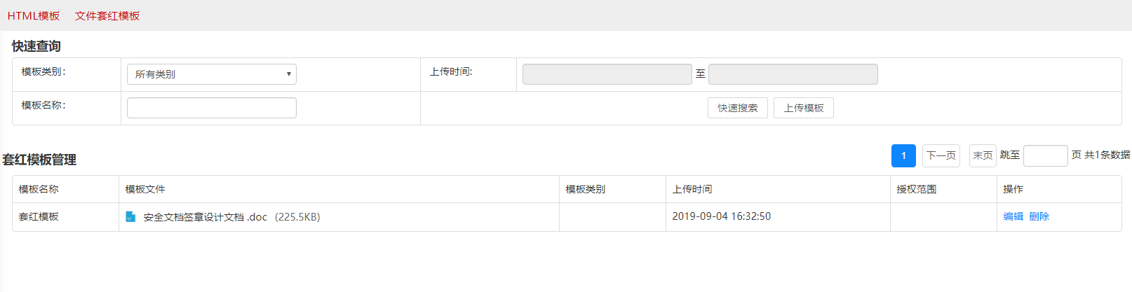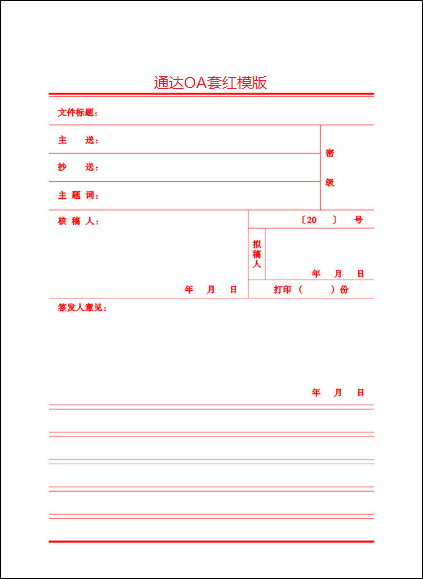 套红模版保存后,在设置中上传,并定义该模版的授权范围,即哪些部门或角色的人能够套用该套红模版。套红模版一般用于文档在线编辑。