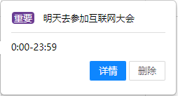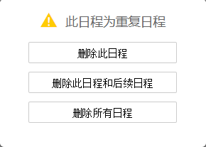 周期日程删除分为删除当前日程、删除此日程和后续日程、删除所有日程;普通日程删除仅支持删除当前日程。在日历视图下,鼠标移入日程内容区,选择【删除】按钮,进入删除页面。在列表视图下,直接选择【删除】按钮即可。