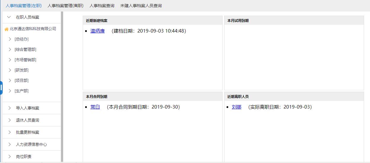 人力资源信息中心:主要展示最近一个月新建档案、试用到期、合同到期、离职人员。