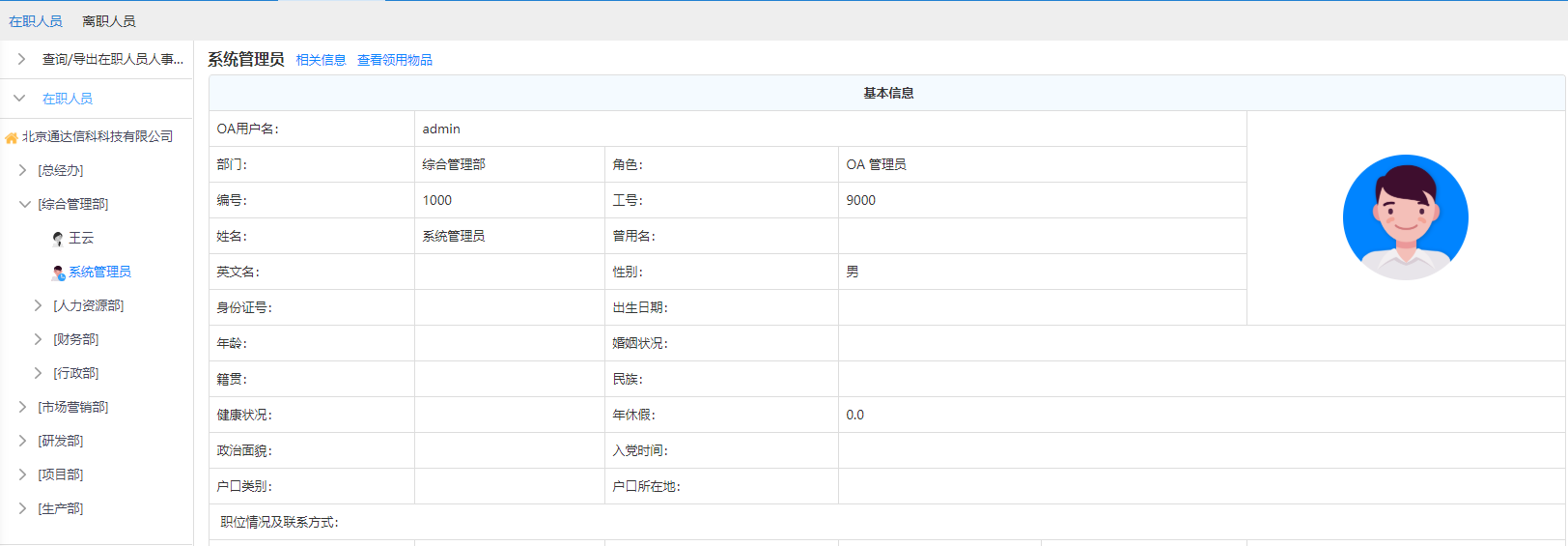 在离职人员选项中,可以根据人事档案中的OA用户名、姓名、性别等字段,查询出离职人员的详细信息,其操作类似在职人员的查询。