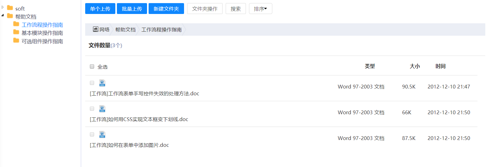 网络硬盘的设置见“【系统管理】-【知识管理设置】-【网络硬盘设置】”,使用中,用户权限也分为:“访问权限”、“新建权限”、“下载打印权限”和“管理权限”四种。访问时,文件夹内的文件以列表方式显示,但是文件夹都在左边的文件夹列表中显示。
