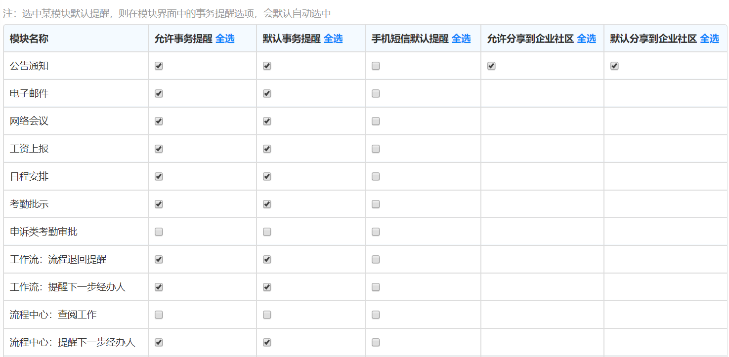 短信提醒设置模块是设置一些模块的默认提醒功能,允许事务提醒,勾选代表该模块允许使用事务提醒,默认事务提醒勾选则该模块事务提醒默认为选中状态。手机短信默认提醒勾选则该模块手机短息提醒默认为选中状态。