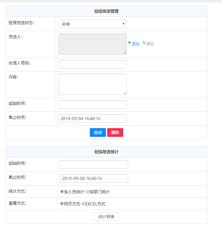 短信发送统计的功能,主要是根据起止时间的选择,按照人员或部门进行统计,并生成一个统计的报表。报表可以按照网页或者EXCEL的方式生成。