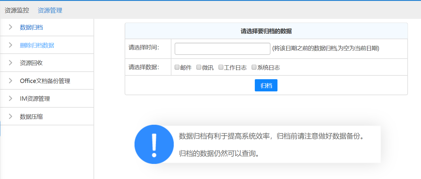 系统资源管理中可以归档和回收及设置系统资源。对数据也可以进行压缩,压缩的数据包括:内部邮件、工作日志、公告通知和新闻,数据压缩会降低数据库占用的磁盘空间,从而提高数据库读写性能。由于数据压缩的过程可能较慢,在大数据量的情况下,建议在无人使用OA时,分批进行数据压缩,每次压缩不超过5000条数据库记录。