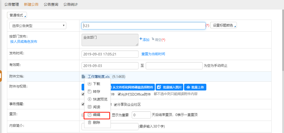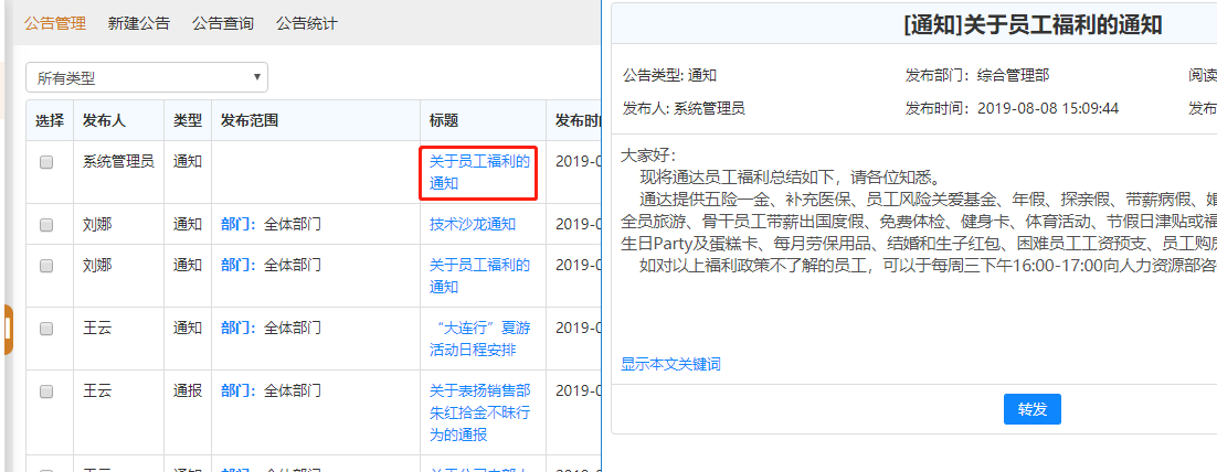 进入公告通知管理界面显示的公告通知为用户自己发布,或用户具备的“管理范围”内的部门公告(默认可以管理自己本部门用户发布的公告)