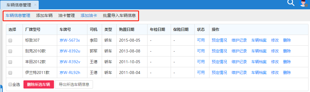 车辆信息管理模块用来管理车辆的基本信息,可添加新车辆,也可对已有的车辆信息进行修改和删除,还可查看每辆车的预定情况。将所有车辆按照状态分类列出,方便用户查询和管理。