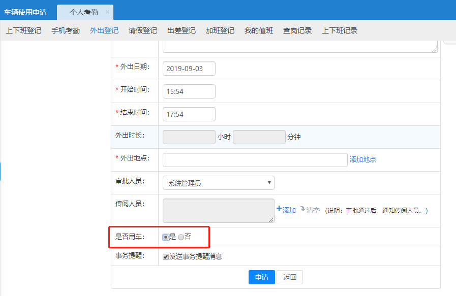 外出登记可选择是否使用车辆,如果用车则直接链接用车申请。